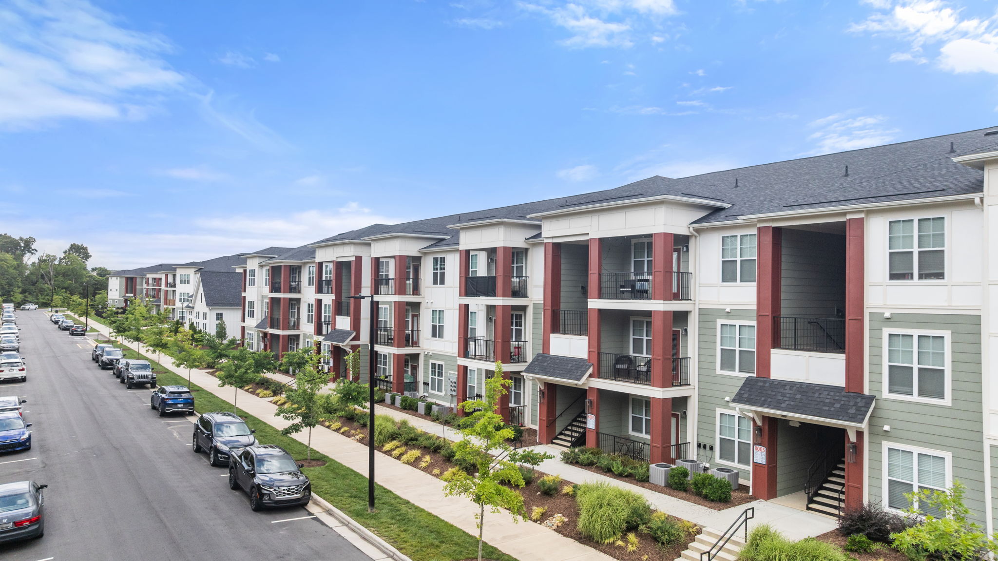Architecturally, Giddy Hall embraces a clean, contemporary aesthetic that reflects today’s multifamily design standards while maintaining a welcoming, residential scale. Composed of warm materials, rhythmic façades, and generous windows, the design brings light and texture to each building. Inside, one-, two-, and three-bedroom apartments feature open layouts, modern finishes, and private balconies or patios that extend living outdoors—combining functionality and style in a cohesive community environment.
