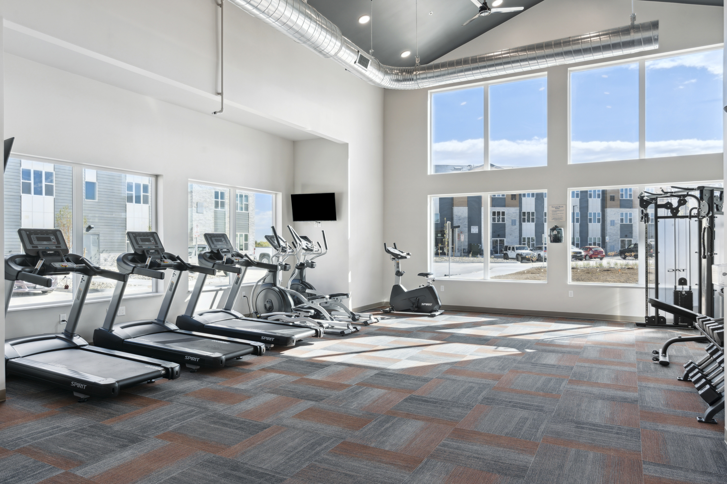 The clubhouse offers shared amenities such as fitness spaces for both adults and kids, community room, co-working area, locker rooms, and a dog washing station.