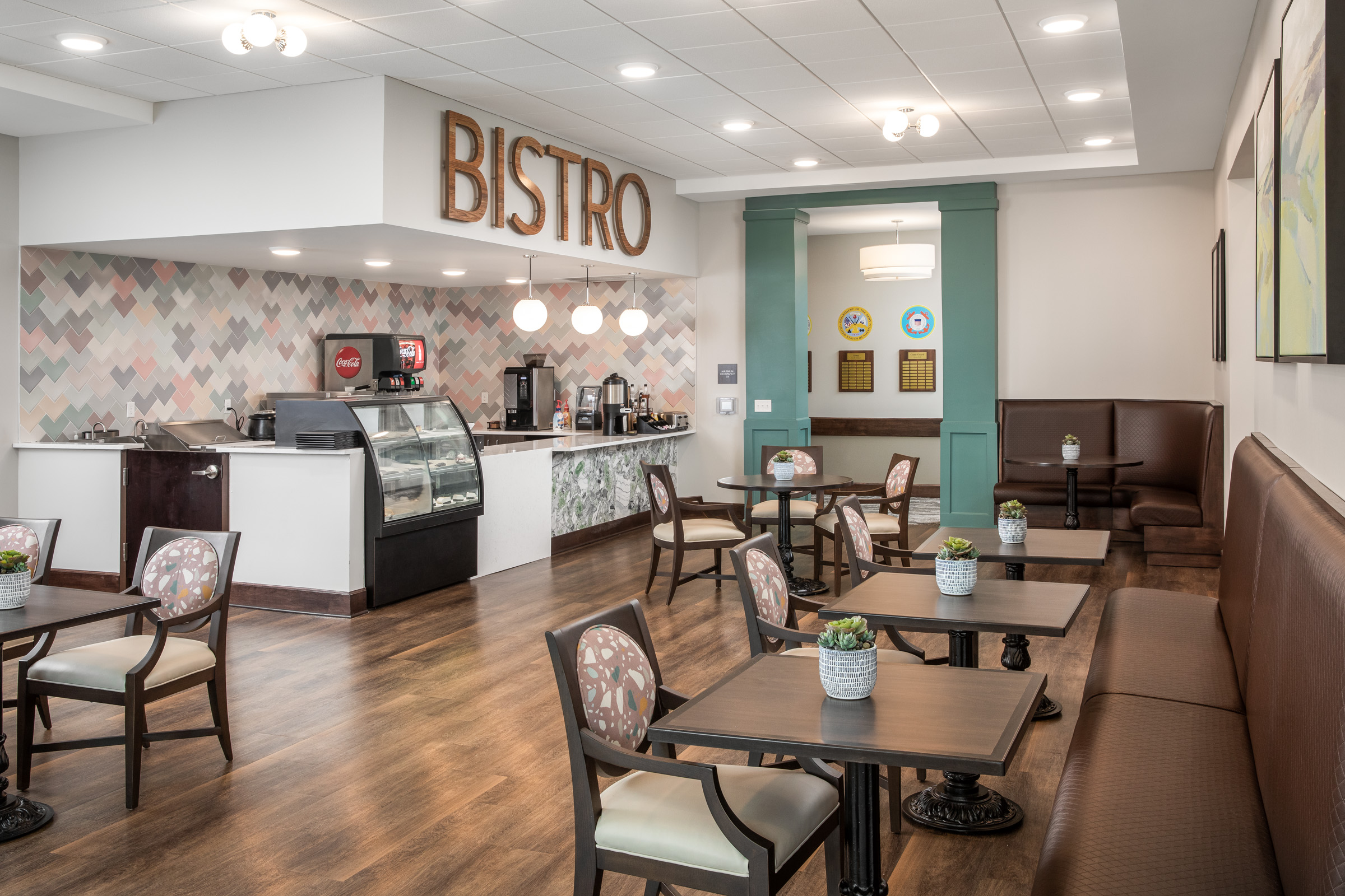 The central clubhouse also referenced as the town center, features a large dining area, offices, a pub, bistro, and library.