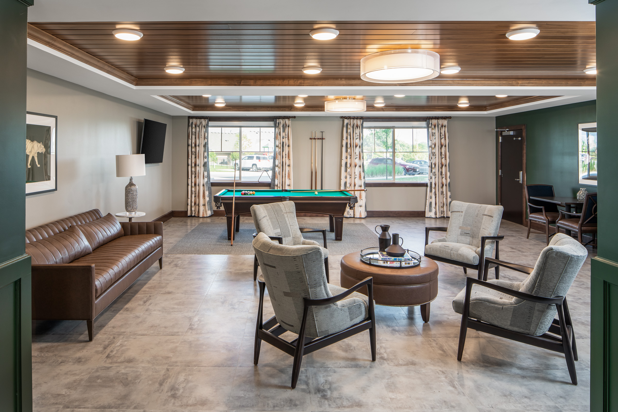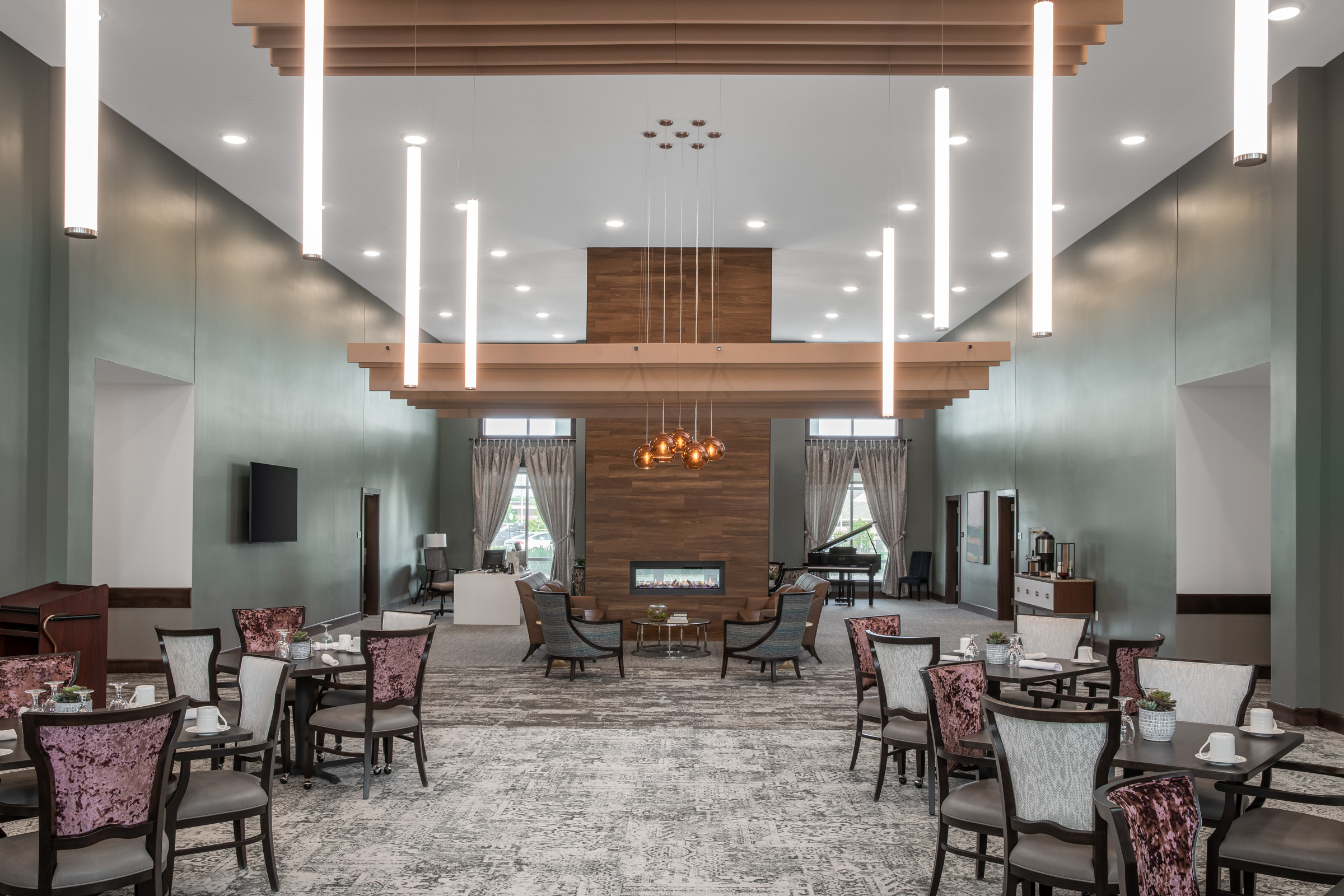 A variety of amenities are available to resident including a fitness center, salon, golf simulator, theatre, lounges, and underground parking. The independent living portion of the building is a 4-story wood construction while the assisted living and memory care portions are 3-story steel stud.